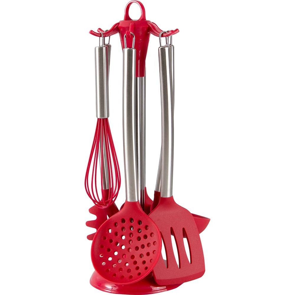 CONJUNTO DE GADGETS DE SILICONE COM CABO INOX 7 PEÇAS VERMELHO
