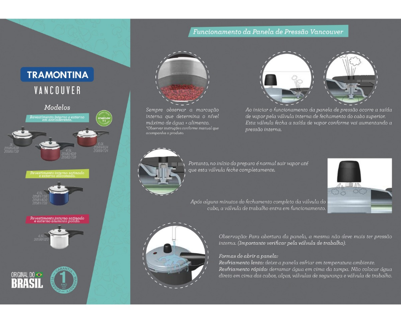 As panelas Vancouver suportam qualquer pressão para fazer bonito na cozinha. São três válvulas de segurança que atuam juntas para aprimorar o máximo o cozimento sem riscos de acidentes. Os acabamentos interno e externo contam com antiaderente Starflon T1, enquanto as tampas possuem acabamento externo polido e interno satinado. Trabalham sob pressão de 80 KPa.